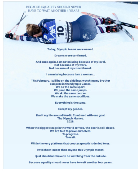 Con su hermano compitiendo en la versión masculina de la disciplina, y ella desde la tribuna, expresó en sus redes: “Los Juegos Olímpicos se enorgullecen de proclamar que estos fueron los Juegos con mayor igualdad de género de la historia… cuando solo tenían que añadir la combinada nórdica femenina. Una prueba. Una decisión. Y habrían hecho historia con unos Juegos Olímpicos totalmente igualitarios. ¿Se lo imaginan? En cambio, miramos. Ver la combinada nórdica masculina y ver a mi hermano competir en el escenario olímpico me provocó emociones inexplicables. Rebosaba de orgullo al ver a @niklas.malacinski vivir su sueño. Pero al mismo tiempo, se me partía el corazón. Porque puedo saltar en esquí. Puedo competir. Puedo competir a ese nivel y hacerlo bien. Poca gente en este mundo puede decir eso. No quiero quedarme al margen nunca más”.